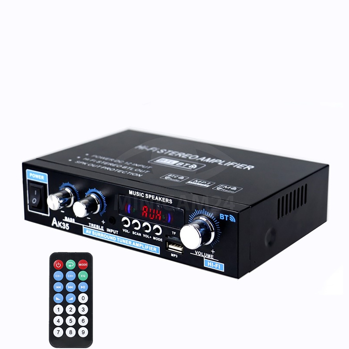 В комплект входят усилитель мощности, пульт дистанционного управления для удобства, адаптер и инструкция, что делает настройку и использование устройства простым и интуитивно понятным. Starklok AK35 — идеальный выбор для домашних аудиосистем и небольших мероприятий.